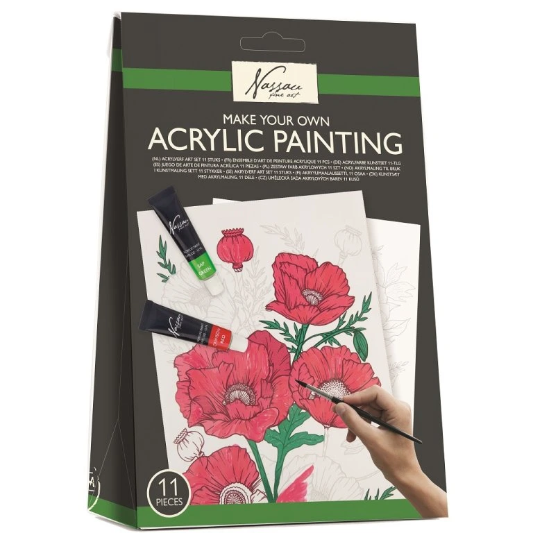 - Širokou paletu akrylových barev: Oživte barvy květin a jejich listů.