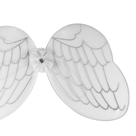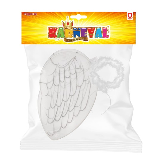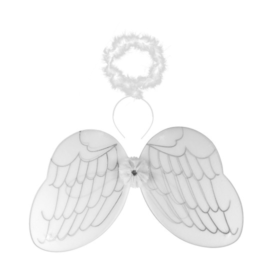 Krásná sada andělských křídel se stříbrným zdobením olemovaná peříčky zároveň obsahuje i krásnou čelenku se svatozáří také vyrobenou z peříček.