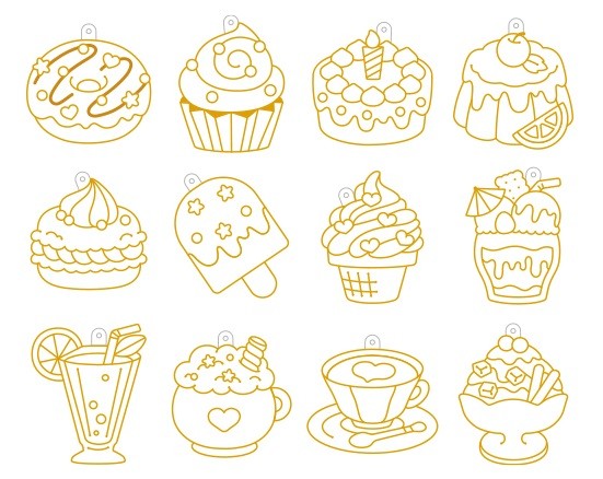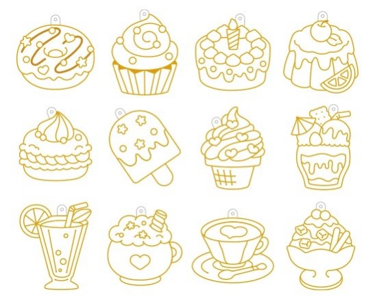 - 12 ks závěsných sklíček se zlatou konturou (cca 8 cm) s motivy dezertů – pro snadné a přesné vybarvování