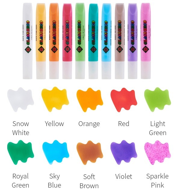 - 10 ks barev na sklo (10,5 ml): bílá, žlutá, oranžová, červená, světle zelená, tmavě zelená, světle modrá, světle hnědá, fialová, růžová se třpytkami