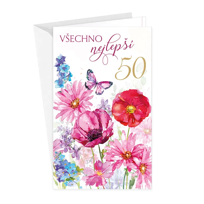 Přání k 50. narozeninám s textem a záložkou na peníze uvnitř přání.