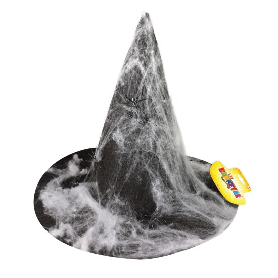 Čarodějnický klobouk s pavučinou, která vypadá jako opravdová! Klobouk černé barvy je potažen pavučinou a mini pavouky.