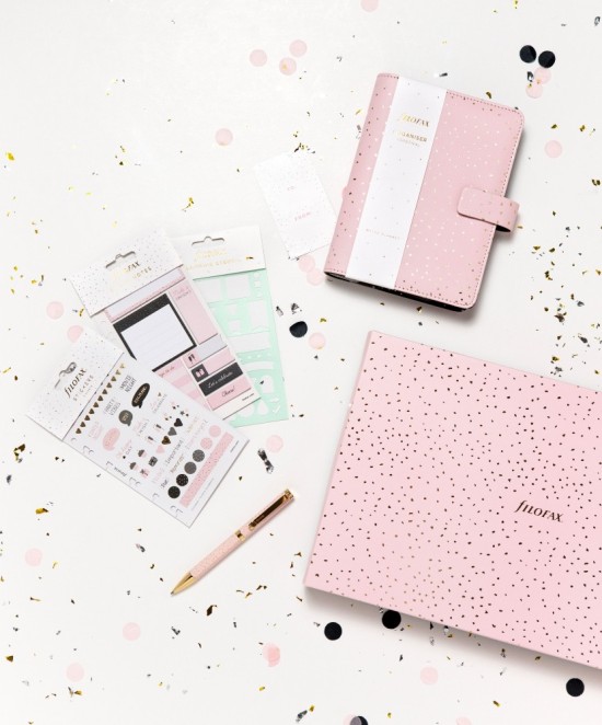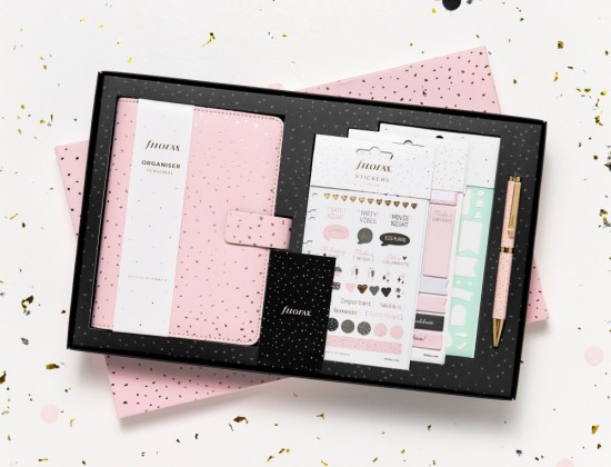 Limitovaná dárková sada diáře Filofax Confetti ve velikosti A6 s kuličkovým perem a dalšími doplňky. Confetti je svým hravým vzorem ze zlaté fólie a velice kontrastní barevnou kombinací oblíbeným u žen. Dodáváno v luxusní krabičce ve stejném designu jako diář.