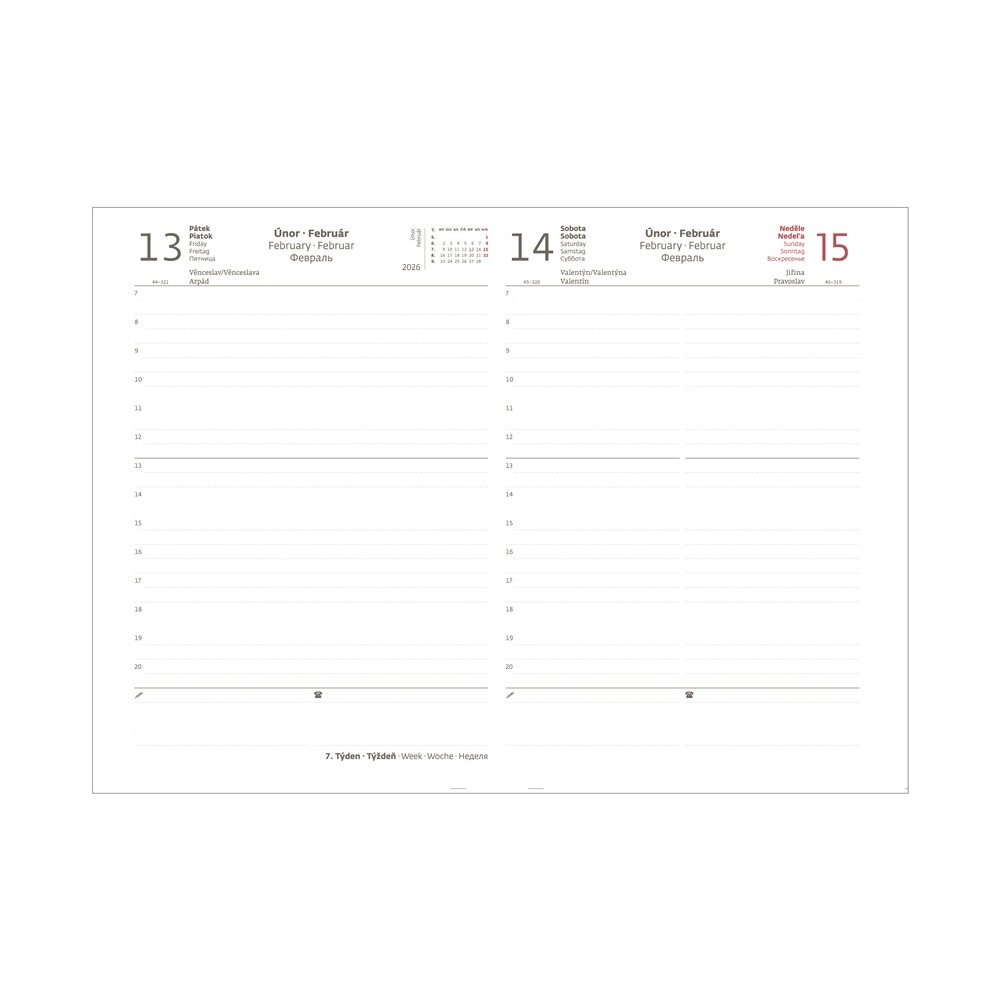 Diář obsahuje mnoho praktických informačních stránek: osobní údaje, plánovací kalendář pro rok 2026, přehledný kalendář pro roky 2026/2027, seznam křestních jmen a mezinárodních svátků, mezinárodní telefonní předvolby a důležitá telefonní čísla, prostor pro poznámky a plánovač dovolené. Kalendárium zahrnuje jména a státní svátky v češtině a slovenštině, dny a měsíce v pěti jazycích (čeština, slovenština, němčina, angličtina, ruština), počet dnů od začátku do konce roku, měsíční fáze a mapy České republiky, Slovenska a Evropské unie.