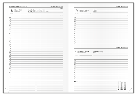 Denní diář formátu B6 je vyráběný z matného hladkého lamina s parciálním lakem, který dodává každému diáři šmrnc. Jedná se nejen o skvělý doplněk, ale také si budete moci efektivněji plánovat Váš čas. Navíc se tento oblíbený formát pohodlně vejde do každé tašky či kabelky.
