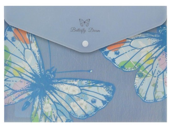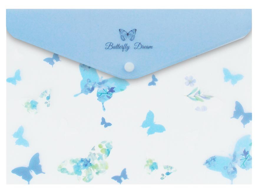 Plastová složka s motivem modrých motýlů je praktickým řešením pro ukládání menších dokumentů, poznámek nebo volných papírů formátu A5.