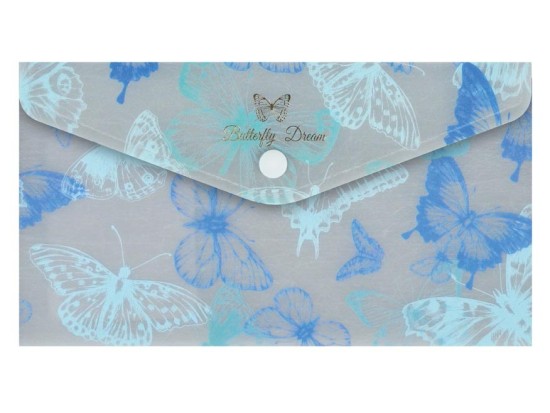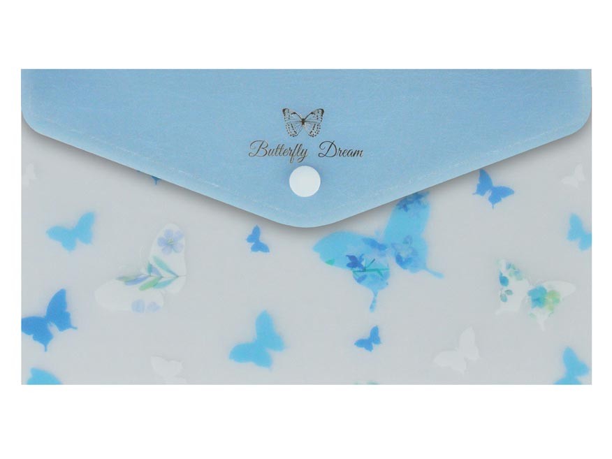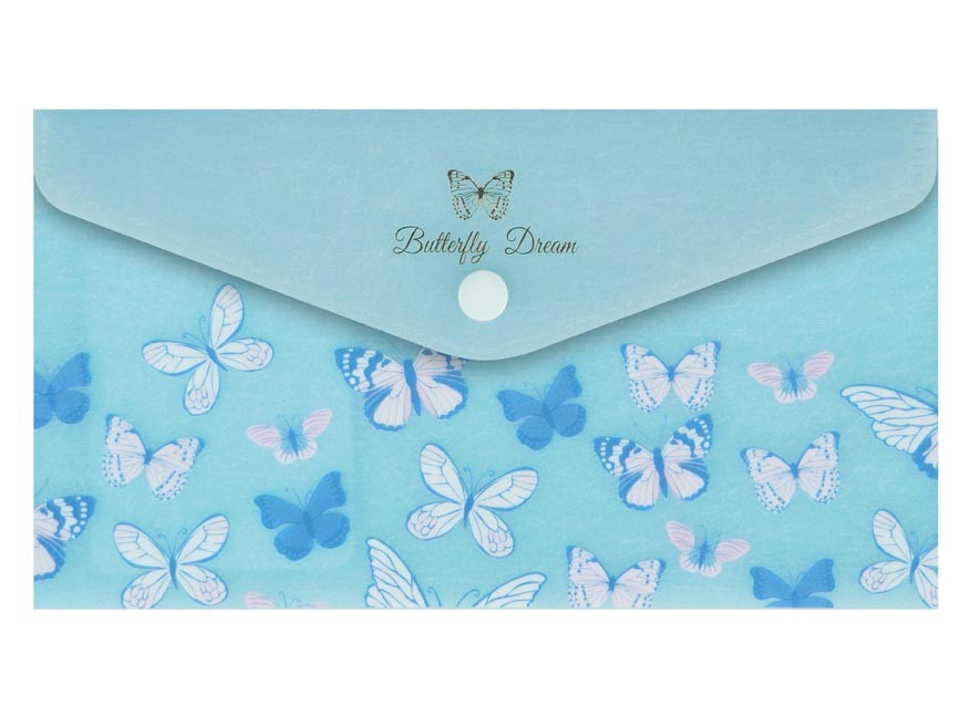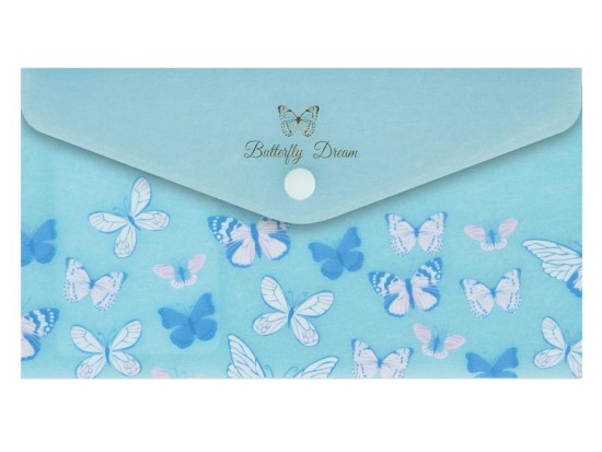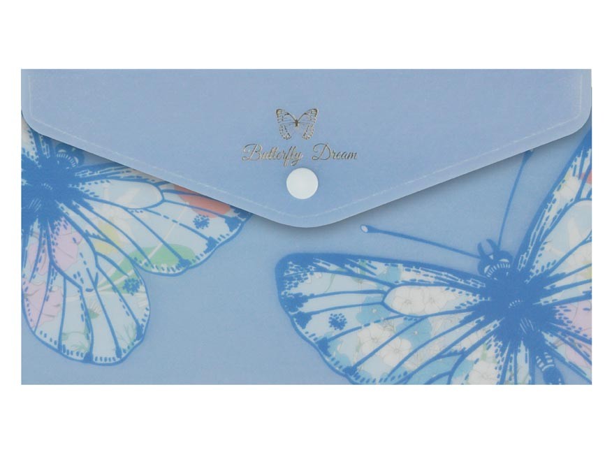 Motýlí motiv v modrých odstínech dodává složce jemný a příjemný vzhled.Složka je vyrobena z kvalitního polypropylenu (PP), který chrání obsah před vlhkostí, nečistotami i pomačkáním. Zapínání na druk udrží dokumenty bezpečně uvnitř, ať už ji nosíte v kabelce, batohu nebo aktovce.