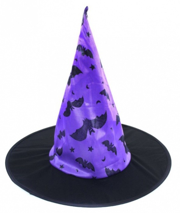 Čarodějnický klobouk s potiskem ve tvaru netopýrů.