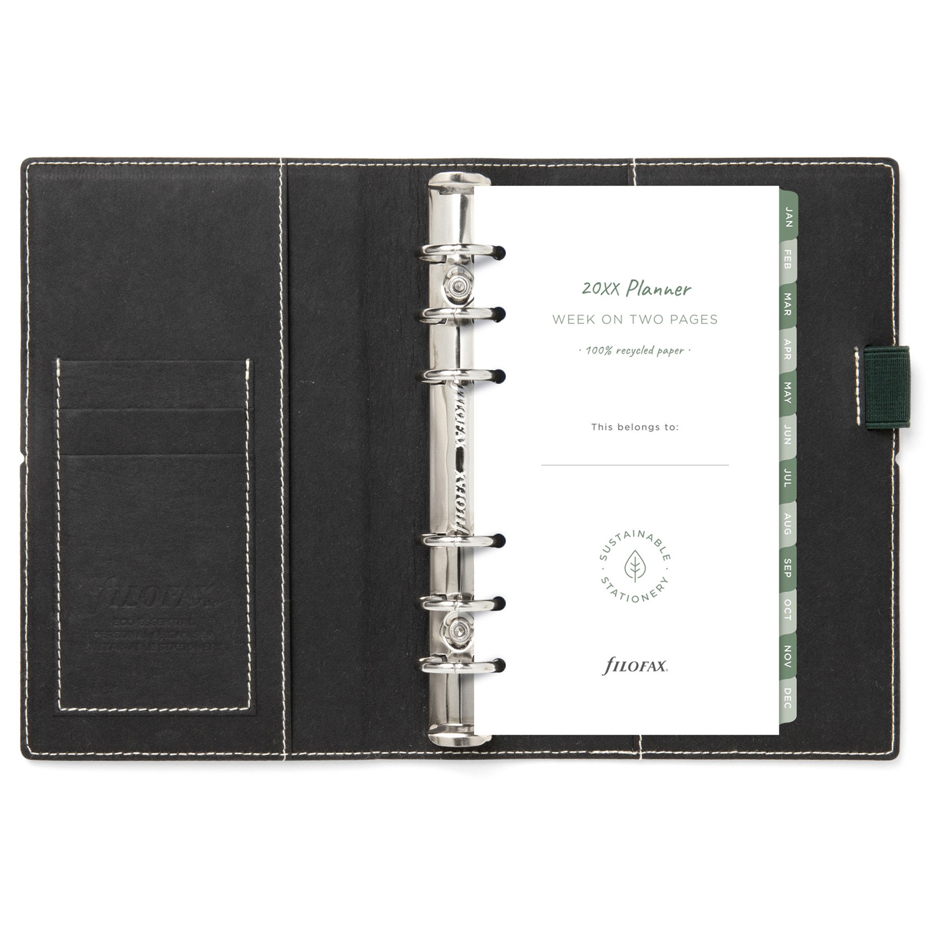 Vychutnejte si uvědomělý život s pomocí tohoto diáře Osobní z kolekce Eco Essential. Tento udržitelný diář má desky z veganského materiálu ze 100% celulózových vláken a Eco náplň s kalendářem týden na 2 strany vytištěný sójovým inkoustem na recyklovaném papíru s certifikací FSC. Řada udržitelných papírenských potřeb.