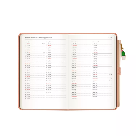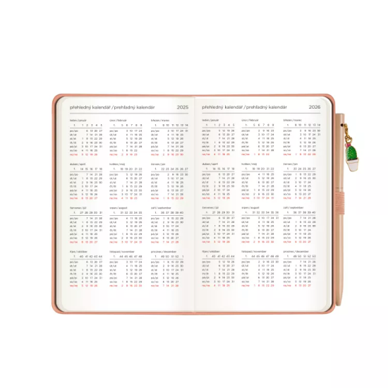 V diáři najdete přehled roku 2025 a 2026, měsíční plánovač, plánovací kalendář, státní svátky, astrologický kalendář, důležitá telefonní čísla, mezinárodní předvolby a abecední přehled křestních jmen.