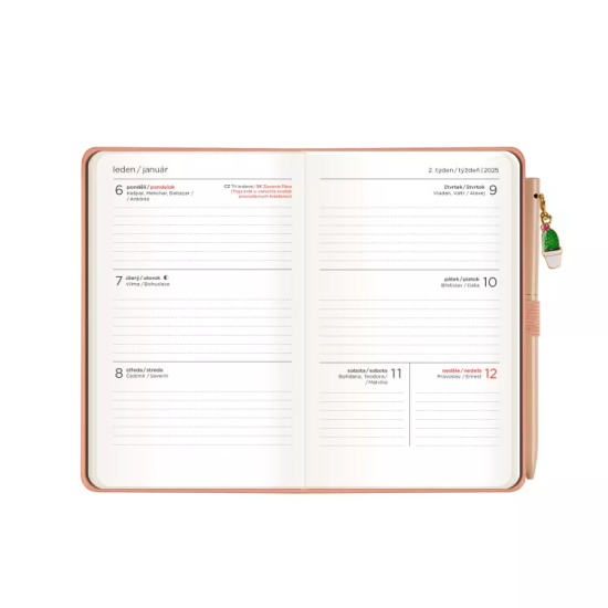 Diáře s propiskou na rok 2025 mají týdenní kalendárium s velkým prostorem na poznámky.