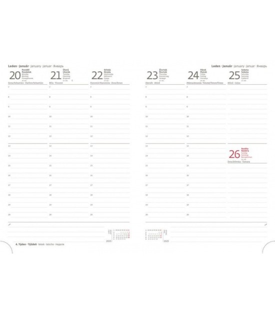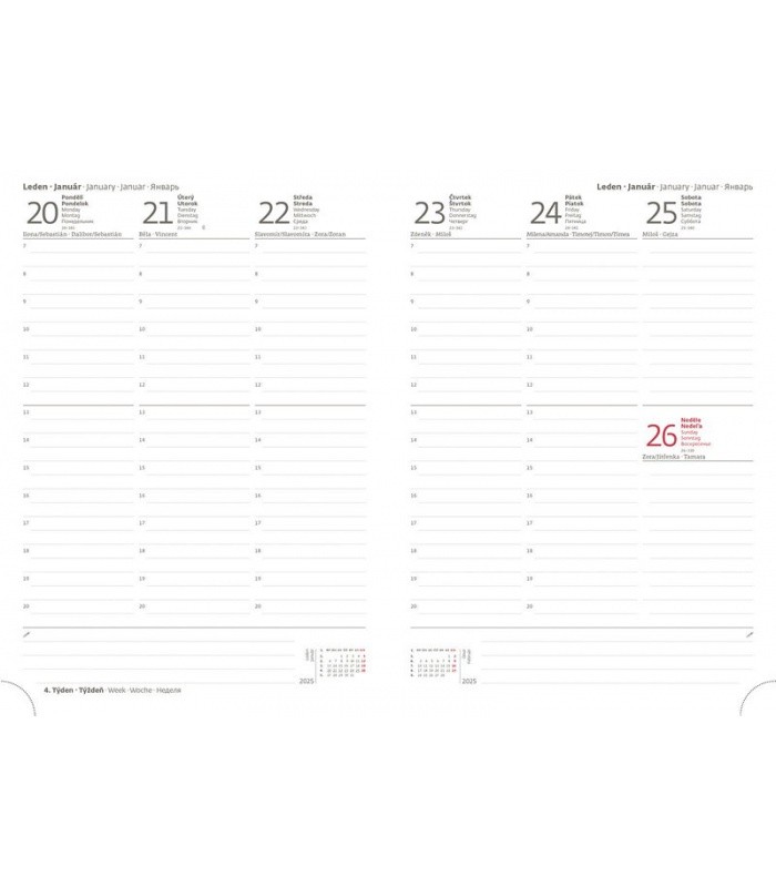 Týdenní diář na rok 2025 ve formátu B5. Desky jsou zhotoveny z kvalitní matné koženky Vivella, která je velmi příjemná na dotek.