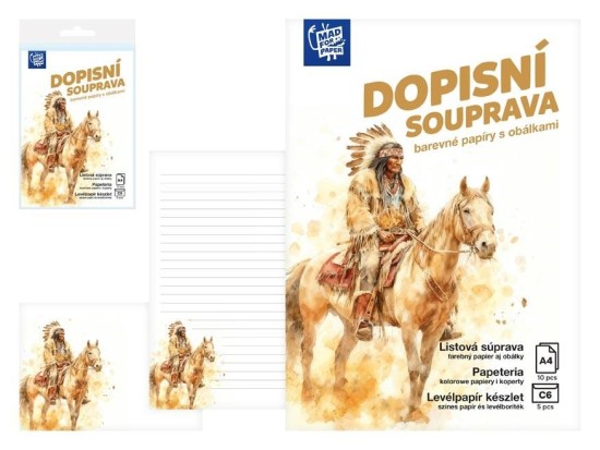 Psaní dopisů nemusí být nudná záležitost. Motiv indiána na koni dodává této dopisní soupravě dobrodružný charakter. Linkované listy formátu A4 vám pomohou udržet text hezky v řádcích a psaní tak zůstává přehledné. Obrázkový motiv je na papíru umístěn tak, aby dopis zpříjemnil, ale zároveň nechal dost prostoru pro vlastní slova.
