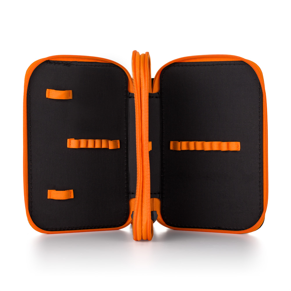 Školní penál dvoupatrový bez náplně. Penál obsahuje 25 gumových poutek pro uložení všech psacích potřeba a drobností potřebných k výuce. Penál má pevný zip s velkými taháčky pro snadnou manipulaci. Jedno patro je opatřeno průhlednou přihrádkou pro týdenní rozvrh.