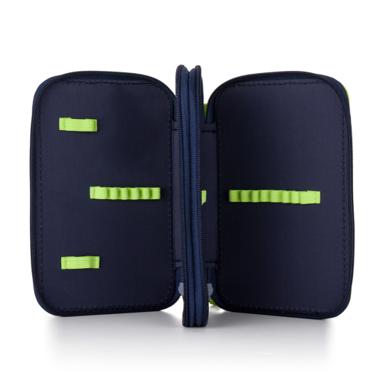 Školní penál dvoupatrový bez náplně. Penál obsahuje 25 gumových poutek pro uložení všech psacích potřeba a drobností potřebných k výuce. Penál má pevný zip s velkými taháčky pro snadnou manipulaci. Jedno patro je opatřeno průhlednou přihrádkou pro týdenní rozvrh.