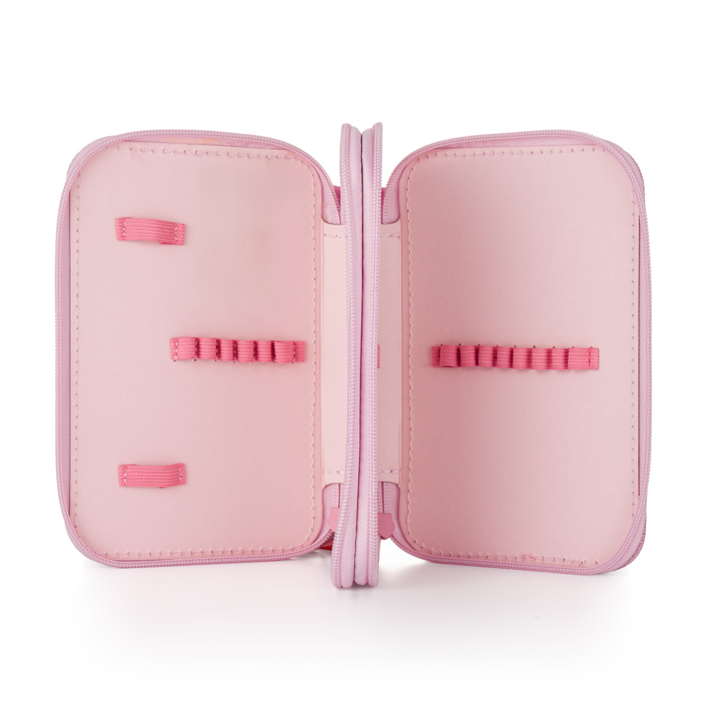 Školní penál dvoupatrový bez náplně. Penál obsahuje 25 gumových poutek pro uložení všech psacích potřeba a drobností potřebných k výuce. Penál má pevný zip s velkými taháčky pro snadnou manipulaci. Jedno patro je opatřeno průhlednou přihrádkou pro týdenní rozvrh.
