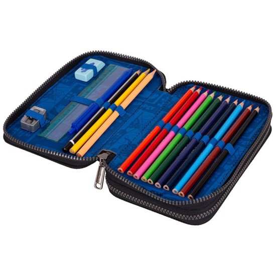 Vybavený 2 zipý školní penál CoolPack Jumper 2 Obsahuje: • trojhranné pastelky Colorino 12 ks • barevné fixy Colorino 18 ks • trojhranná tužka HB Colorino 1 ks • kuličkové pero Patio Base 1 ks • pravítko 15 cm • pryž Colorino • ořezávátko