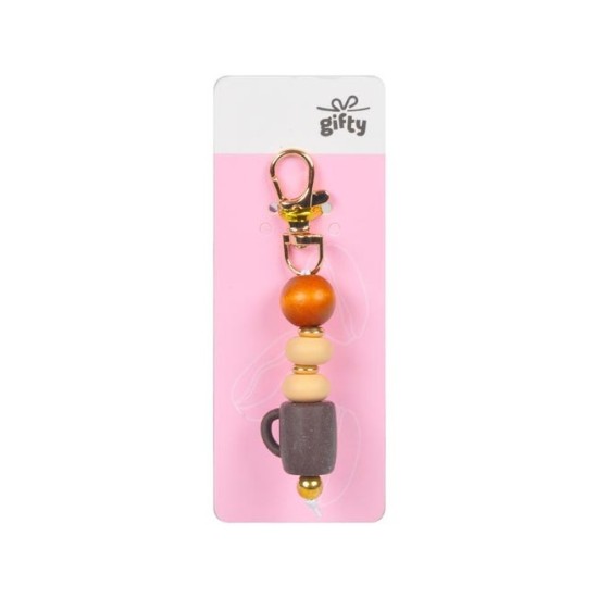 Silikonový přívěsek Káva od Gifty je hravý detail, který si můžete připnout na klíče, batoh, kabelku nebo třeba peněženku. Originální kombinace dřevěných a silikonových korálků doplněná drobným přívěskem v podobě hrnku s kávou okamžitě vykouzlí úsmě