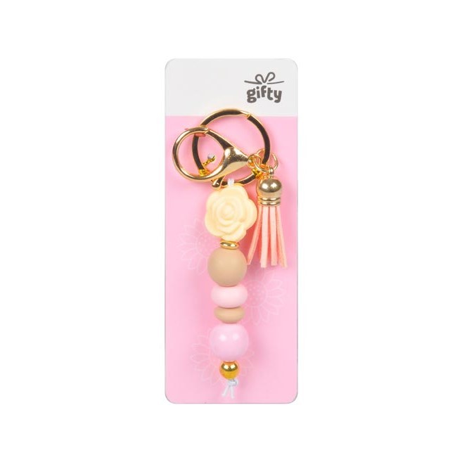 Silikonový přívěsek RŮŽE od Gifty nese romantický motiv. Elegantní kombinace silikonových a dřevěných korálků, doplněná o stylový střapec, působí originálně a moderně.Na první pohled ozdoba, v praxi ale i šikovný pomocník – díky karabince a kroužku ho snadno připevníte, kam jen budete chtít. Klíče v tašce najdete rychleji, batoh získá osobitý vzhled a kabelka jemný dotek originality.