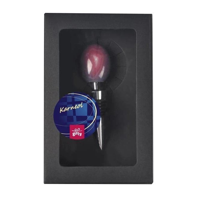 Zátka na víno z kolekce Gifty s výrazný polodrahokamem karneolem, známým svou ohnivou barvou a symbolikou odvahy a vitality, promění každou láhev vína v designový skvost. Uzávěr zátky je zhotoven z odolného pochromovaného kovu, který spojuje praktickou funkčnost s nadčasovou elegancí. Díky těsnění z