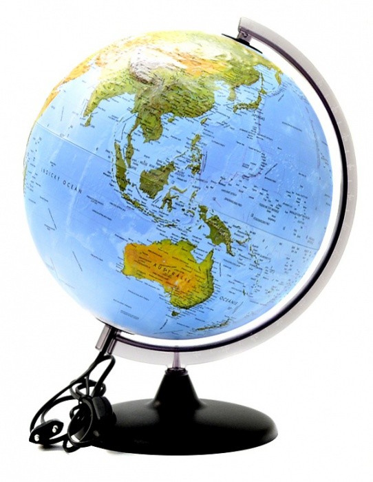 Glóbus svítící Alto Relievo 30 cm.Průměr: 30 cm, výška : 40 cm Měřítko: 1 : 42 500 000 Světelný glóbus, zeměpisná mapa, po rozsvícení mapa politická.Třírozměrná geograficko – politická plastická kartografie. Půlpoledník z „kouřového“ plastu a podstavec z černého plastu.Popisky v če