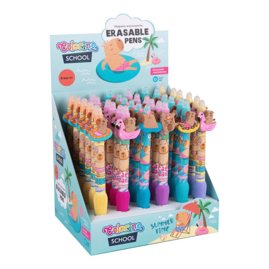 Konec chybám a škrtání v sešitech. Prostě je vymaž a přepiš. Pevná pryž na konci pera a jedinečné složení inkoustu zaručuje jednoduché a opakované gumování. K dispozici náhradní náplň.Gumovatelná pera s usměvavou kapybarou, která tě přenesou do teplých krajů a vodních hrátek. Barevně sladěné tělo a na dotek příjemný pogumovaný grip, ti navíc zaručí pohodlné a radostné psaní.