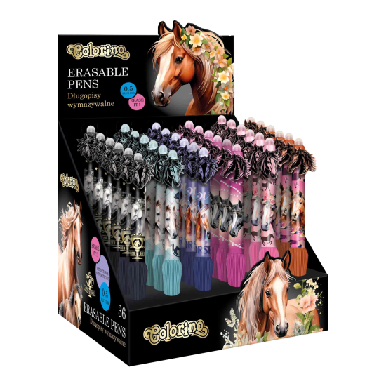 Konec chybám a škrtání v sešitech. Prostě je vymaž a přepiš. Pevná pryž na konci pera a jedinečné složení inkoustu zaručuje jednoduché a opakované gumování. K dispozici náhradní náplň.Kolekce gumovatelných per s krásnými motivy divokých koní. Výrazná stiskací mechanika, barevně sladěné tělo a na dotek příjemný pogumovaný grip, ti navíc zaručí pohodlné a radostné psaní.