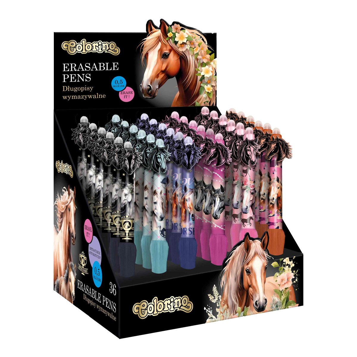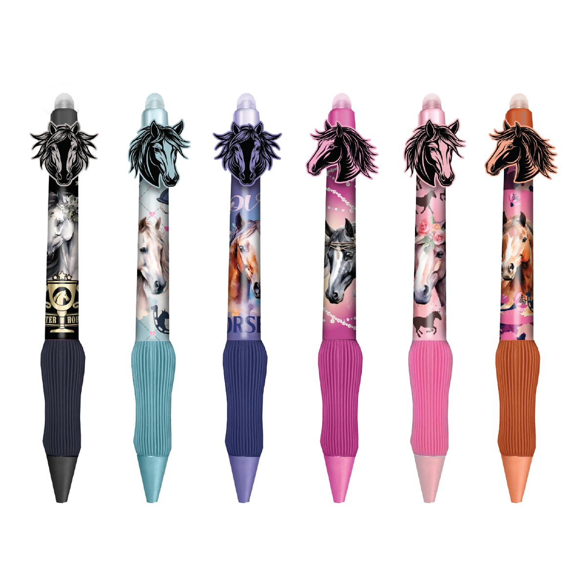 Konec chybám a škrtání v sešitech. Prostě je vymaž a přepiš. Pevná pryž na konci pera a jedinečné složení inkoustu zaručuje jednoduché a opakované gumování. K dispozici náhradní náplň.Kolekce gumovatelných per s krásnými motivy divokých koní. Výrazná stiskací mechanika, barevně sladěné tělo a na dotek příjemný pogumovaný grip, ti navíc zaručí pohodlné a radostné psaní.