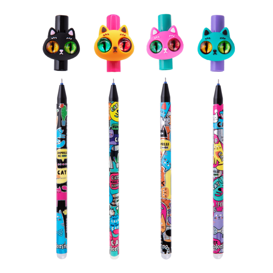 Konec chybám a škrtání v sešitech. Prostě je vymaž a přepiš. Pevná pryž na konci pera a jedinečné složení inkoustu zaručuje jednoduché a opakované gumování. K dispozici náhradní náplň.Gumovatelné pero s roztomilým víčkem okaté kočičky. Kombinace veselých a zářivých barev, které se skvěle doplňují s metalickými motivy na těle pera.