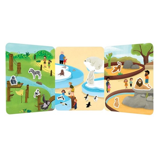 Hra obsahuje velké skládací pozadí a 1 list silikonových samolepek, které lze používat opakovaně. Děti tak mohou tvořit různé scénky dle své fantazie.