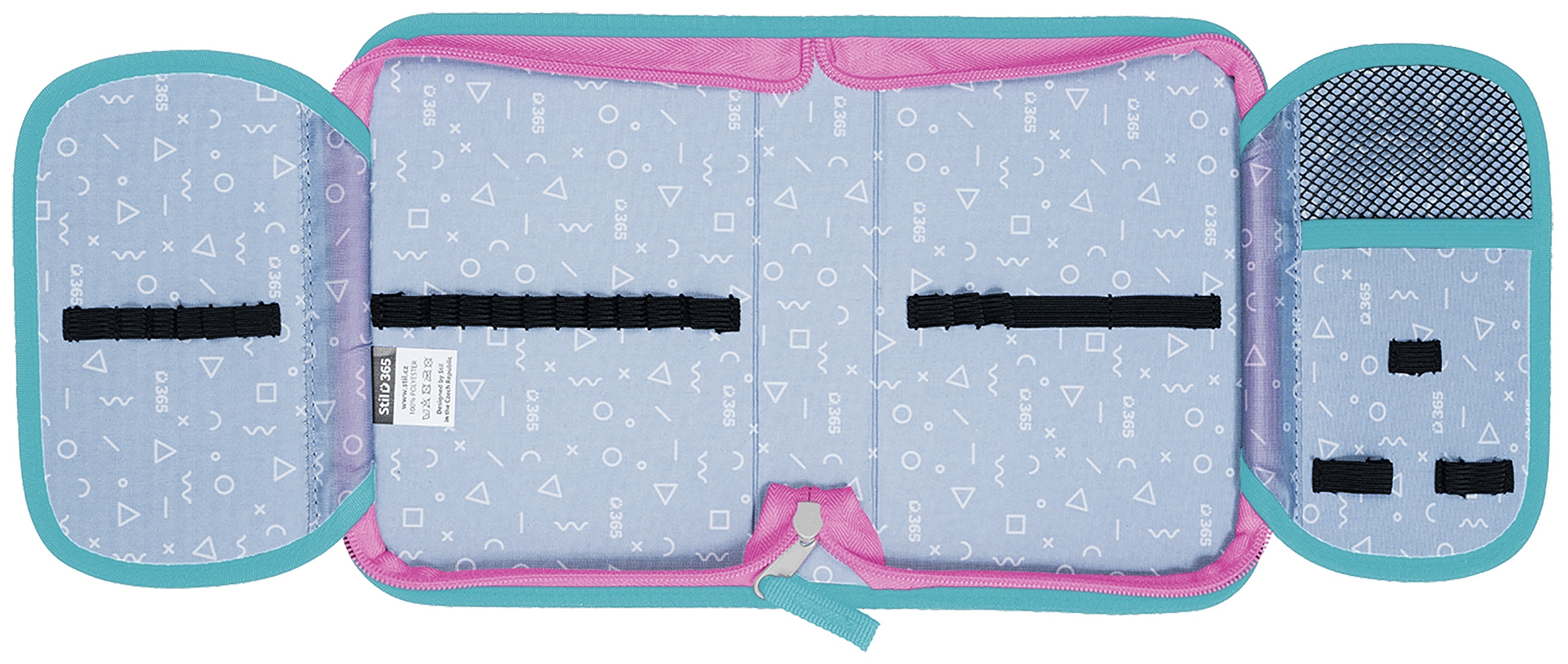 Přesně 24 pevných gumiček různých velikostí slouží k pohodlnému uložení pastelek, psacího pera, tužek, pravítka, ořezávátka a gumy.