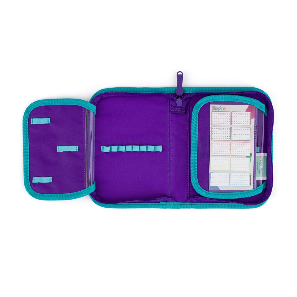 Jednopatrový školní penál s 2 chlopněmi, prázdný obsahuje 25 gumových poutek pro uchycení psacích potřeb. Na vnitřních chlopních jsou průhledné fólie pro rozvrh hodin.
