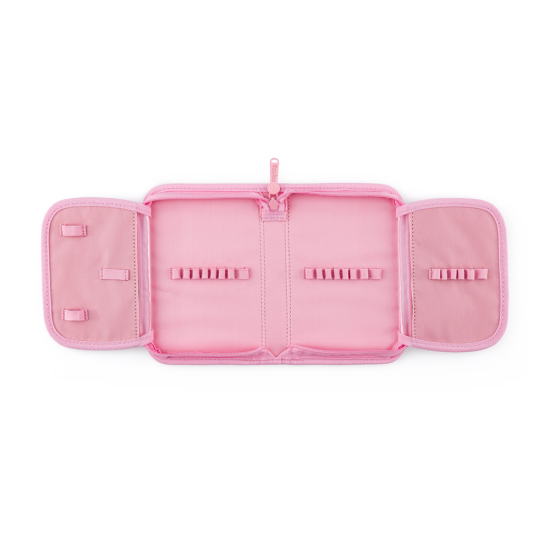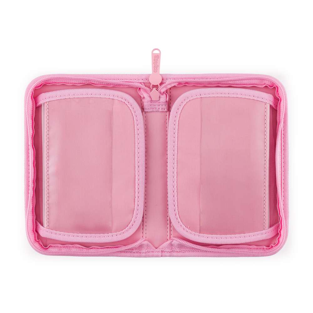 Jednopatrový školní penál s 2 chlopněmi, prázdný obsahuje 25 gumových poutek pro uchycení psacích potřeb. Na vnitřních chlopních jsou průhledné fólie pro rozvrh hodin.