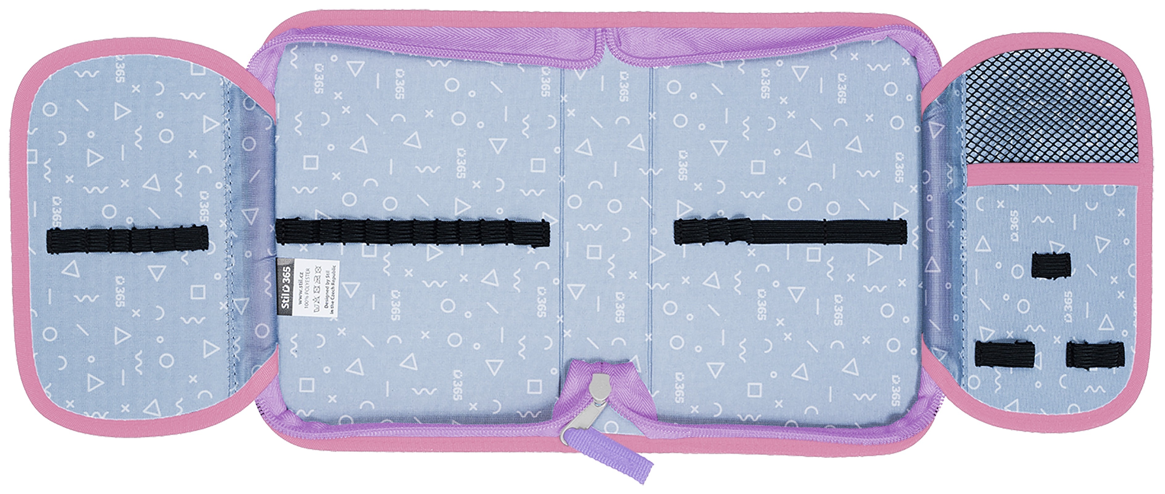 Přesně 24 pevných gumiček různých velikostí slouží k pohodlnému uložení pastelek, psacího pera, tužek, pravítka, ořezávátka a gumy.