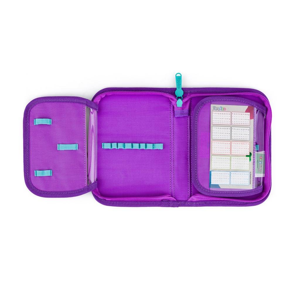 Jednopatrový školní penál s 2 chlopněmi, prázdný obsahuje 25 gumových poutek pro uchycení psacích potřeb. Na vnitřních chlopních jsou průhledné fólie pro rozvrh hodin.