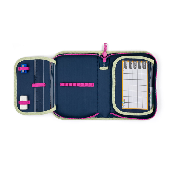Jednopatrový školní penál s 2 chlopněmi, prázdný obsahuje 25 gumových poutek pro uchycení psacích potřeb.