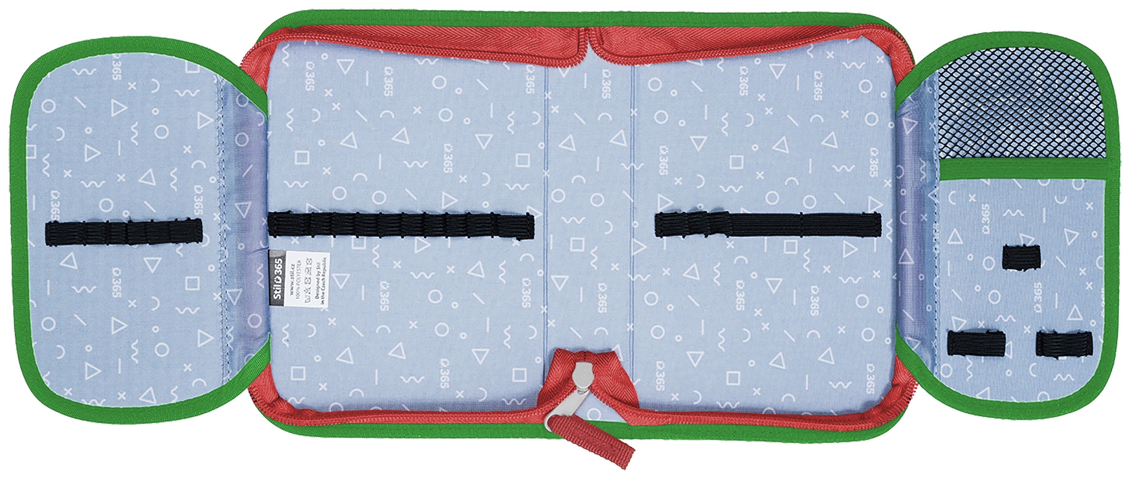 Přesně 24 pevných gumiček různých velikostí slouží k pohodlnému uložení pastelek, psacího pera, tužek, pravítka, ořezávátka a gumy.