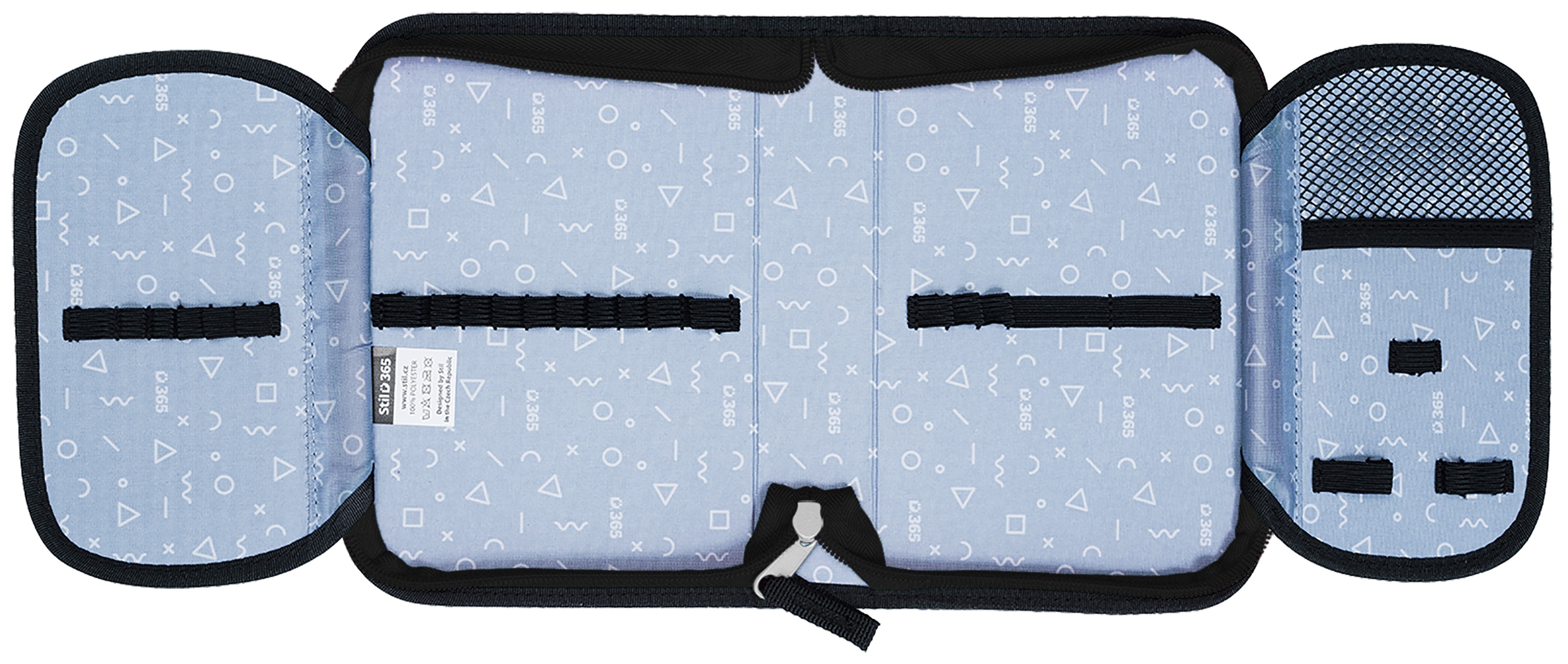 Přesně 24 pevných gumiček různých velikostí slouží k pohodlnému uložení pastelek, psacího pera, tužek, pravítka, ořezávátka a gumy.