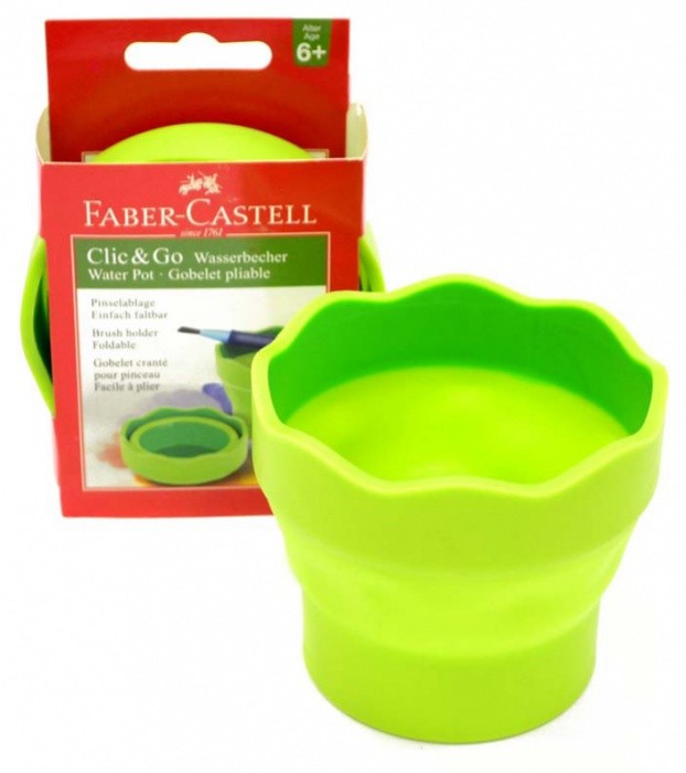 Kelímek na vodu CLIC&GO, který je možné díky jeho skládacímu mechanismu pohodlně složit a jehož zvlněný okraj funguje jako praktické místo pro odkládání štětců.