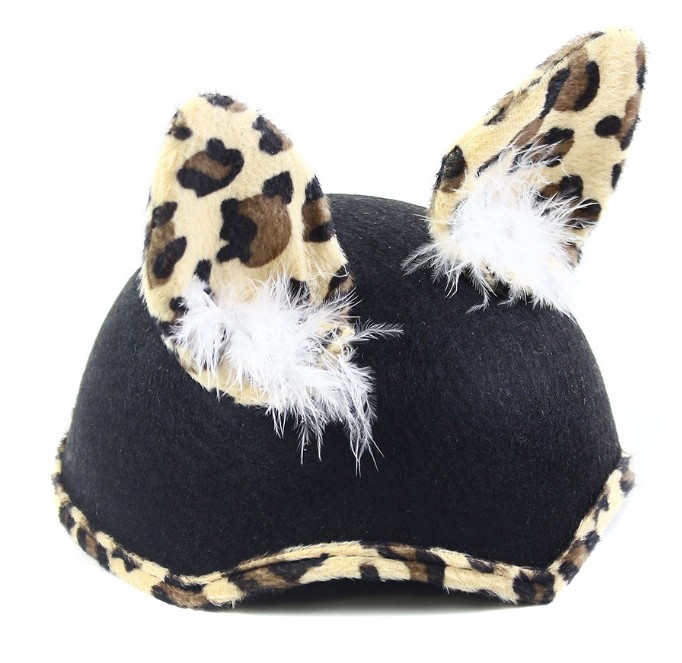 Klobouček černé barvy s tygrovanými oušky a peřím.