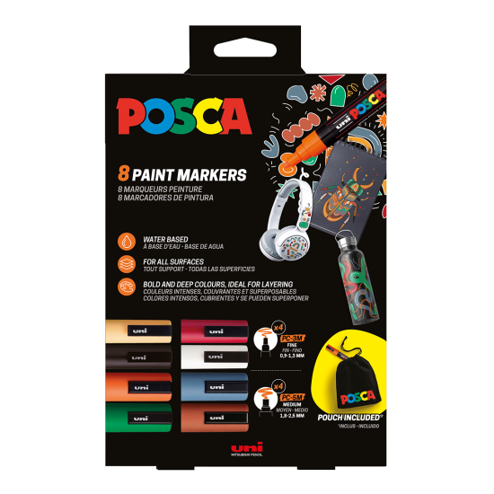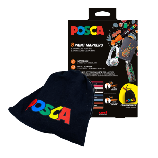 Kombinovaná sada popisovačů velikostí PC-3M a PC-5M v mixu barev. Sada je doplněna o zbrusu nový odstín kaštanové. Součástí balení je stahovací bavlněný pytlík POSCA pro rychlé uschování popisovačů.