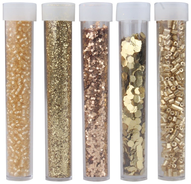 Konfety, korálky, glitry – zlatý mix v tubě (5 × 7 g)