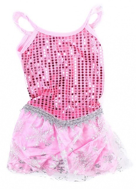 Šatičky pro princezny v růžové barvě jsou zdobeny stříbrnými sněhovými vločkami a růžovými flitry.