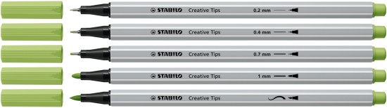 STABILO Creative Tips lze používat různými kreativními způsoby díky různým šířkám stop a hrotům. Ať už jde o propracované monochromatické umělecké dílo nebo barevné nápisy, vysoce kvalitní linery a fixy jsou perfektními nástroji pro všechny druhy kreativních maleb. Zahrnují extra jemnou linku 0,2 mm a dvě jemné linky s odpruženými hroty o šířce stopy 0,4 mm a 0,7 mm, robustní fix s šířkou stopy 1 mm a fix s flexibilním štětcovým hrotem. Prémiový výběr pěti velikostí hrotu je k dispozici v různých sadách s různými barevnými kombinacemi. Inkoust všech linerů a fixů je na vodní bázi a lze je vodou rozmývat, což umožňuje vytvářet dechberoucí efekty a barevné přechody.