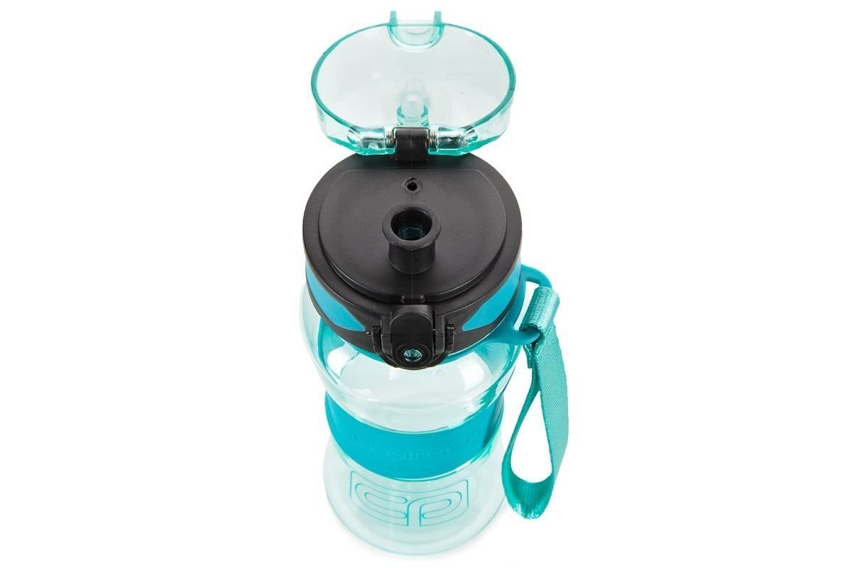 Gumička navíc usnadňuje držení láhve v ruce a pásek umožňuje její připevnění kamkoli.