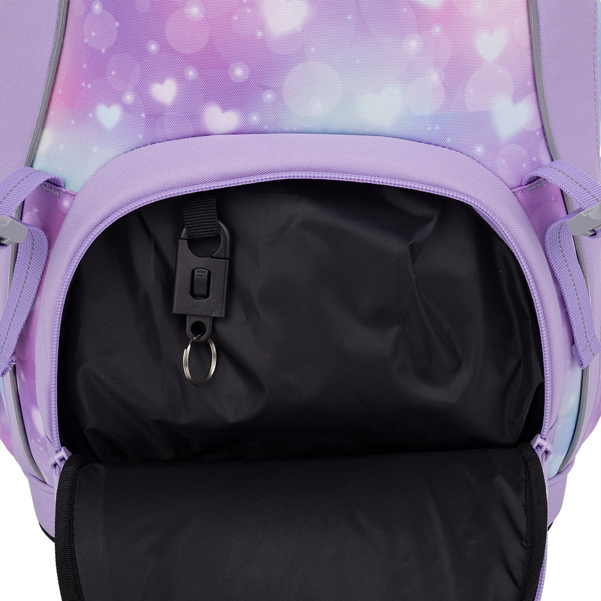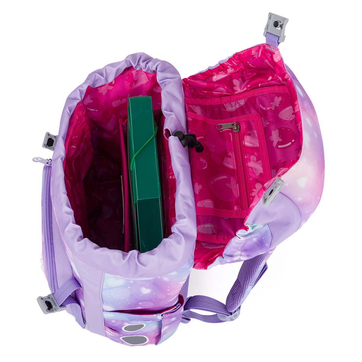 V objemné hlavní kapse najdete organizér, dvě malé kapsy na drobnosti a jmenovku. Po stranách jsou dvě pevné kapsy na lahev ZIVA o objemu 0,5 litru. Do přední kapsy jsme přidali odnímatelnou karabinu na klíče, skvěle se sem vejde také penál ve stejném designu, nebo naše krabičky na svačinu s vyjímatelným organizérem.