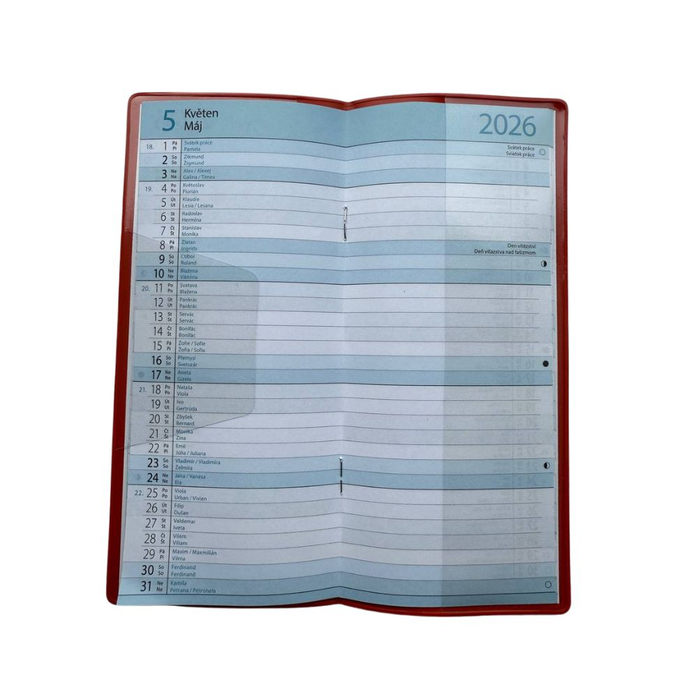 Obsahuje 32 stran s měsíčním kalendáriem od prosince 2025 do ledna 2027. Nabízí dopolední a odpolední hodinové plánování, čísla týdnů, přehled českých křestních jmen a státních svátků.