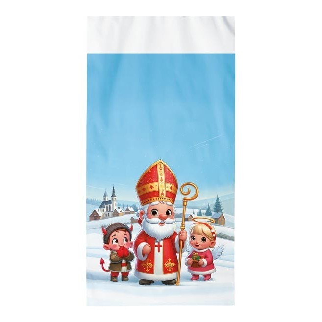 Mikulášský sáček s potiskem Mikuláše, čerta a anděla je ideální pro balení mikulášské nadílky. Poskytuje dostatek místa na sladkosti, malé dárky nebo ovoce.