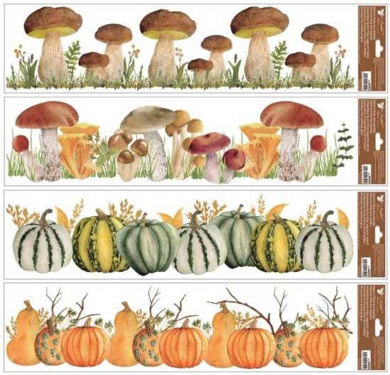 Motiv hříbků, dýní a podzimních rostlin vnese do interiéru atmosféru sklizně a pohody. Skvěle se hodí na spodní části oken, skleněné dveře nebo vitríny během podzimních měsíců.