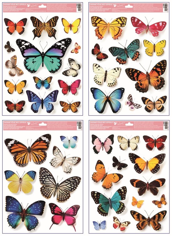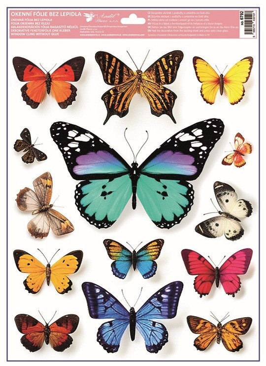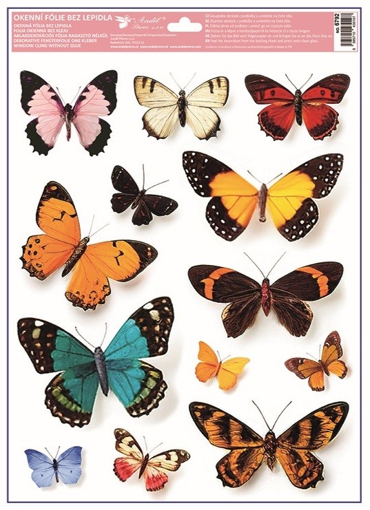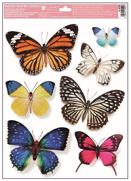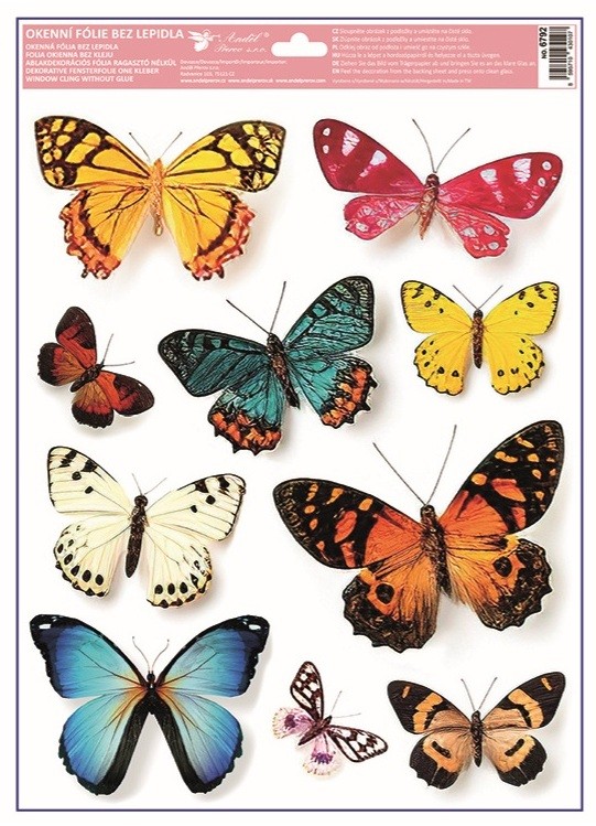 Tato dekorační okenní fólie s motivem barevných motýlů o rozměru 30 × 42 cm rozzáří okna jemným třpytem a živými barvami. Přilne elektrostaticky – bez lepidla, nezanechává žádné stopy, snadno se aplikuje a je opakovaně použitelná.